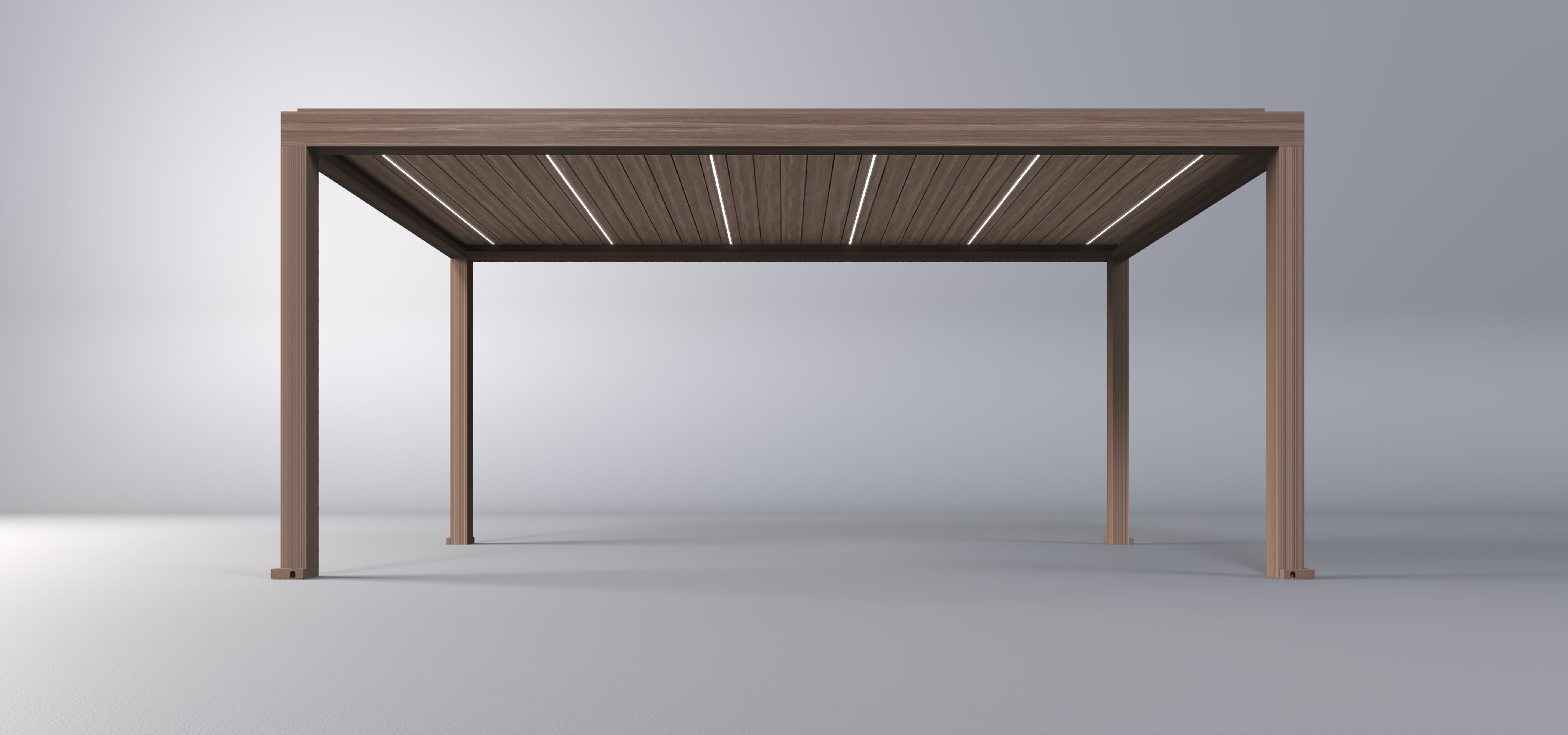 Éclairage LED intégré au niveau des lames et dimmable, modifiable entre blanc chaud (3000K) et blanc froid (6000K) pour créer l’ambiance parfaite en toute saison - Gouttières intégrées ultra-étanches, pour une évacuation discrète de l’eau même en cas de fortes pluies